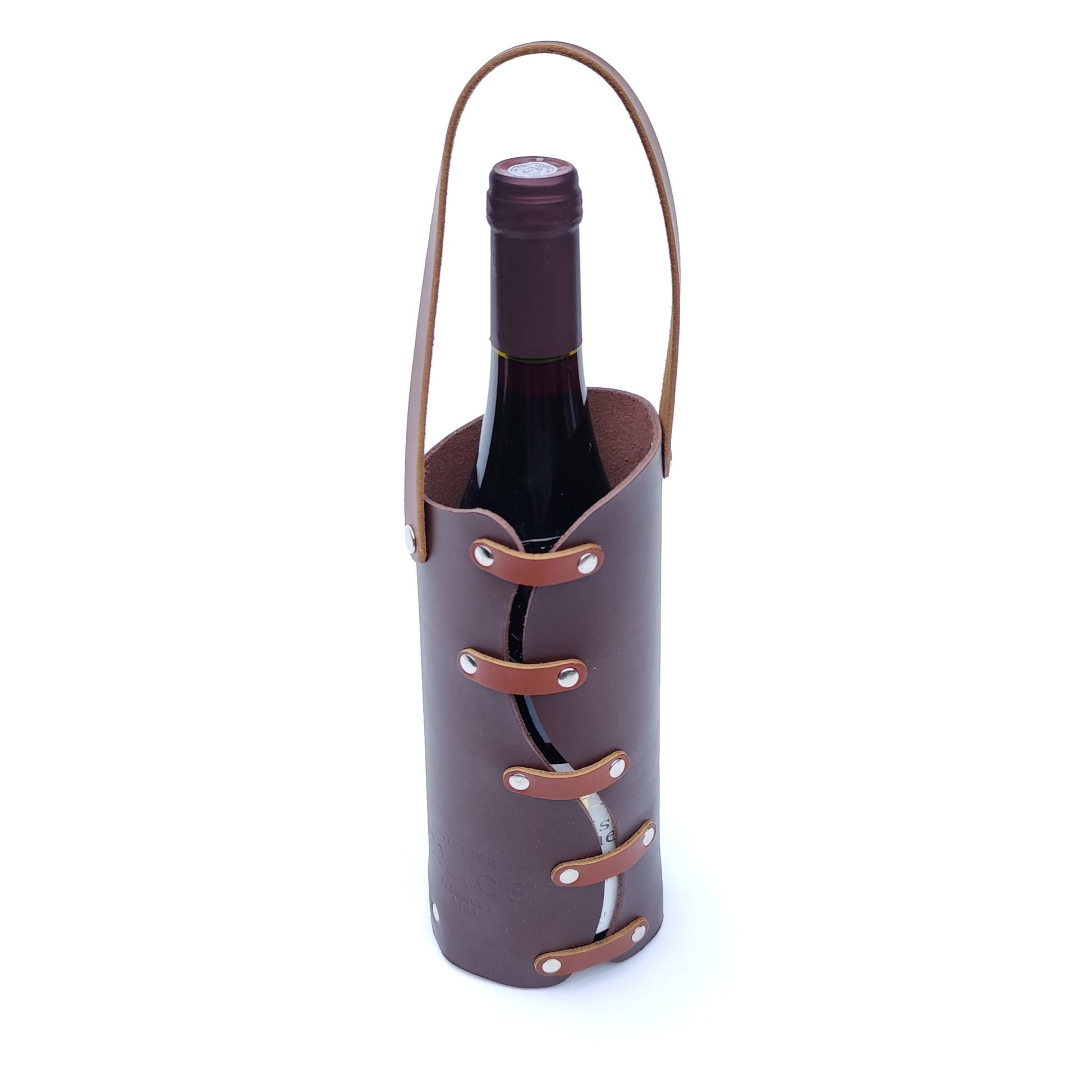 Transportez vos bouteilles avec style grâce à ce porte-bouteille en cuir au tannage végétal, mêlant robustesse et raffinement. Conçu dans un cuir épais de grande qualité, il est assemblé à l’aide de lanières fixées par rivets métalliques, offrant une structure solide et un design original.
